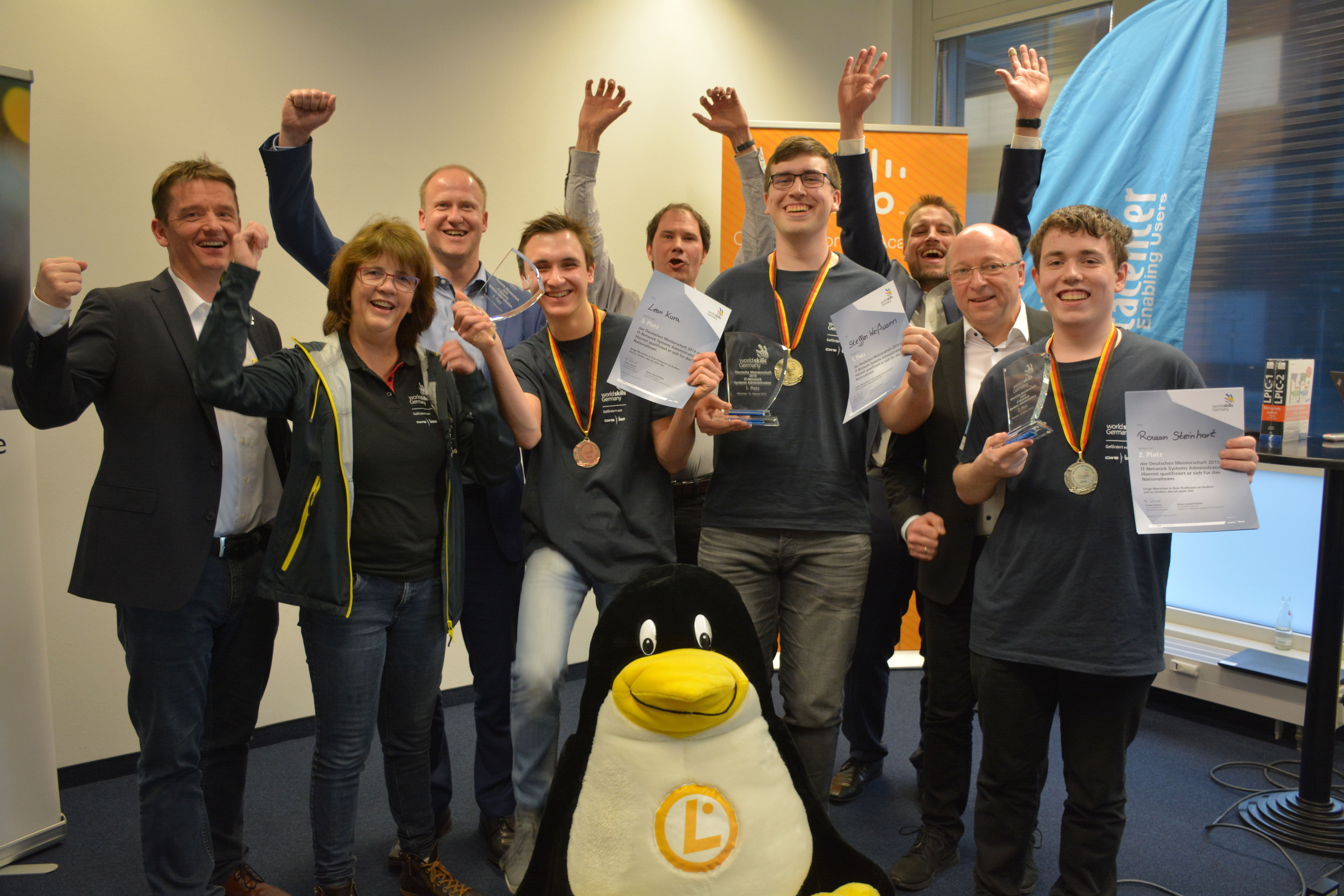 Jubelten gemeinsam: Reiner Brandt (LPI Central Europe), Nationaltrainerin Almut Leykauff-Bothe, Michael Kämper (Cisco Systems), Leon Kura (Bronze), Carsten Johnson (Cisco Networking Academy), Sieger Steffen Weißmann, Fabian Leenen (Computacenter), Jens Bielicke (WorldSkills) und Roman Steinhart (Silber) (v.l.)