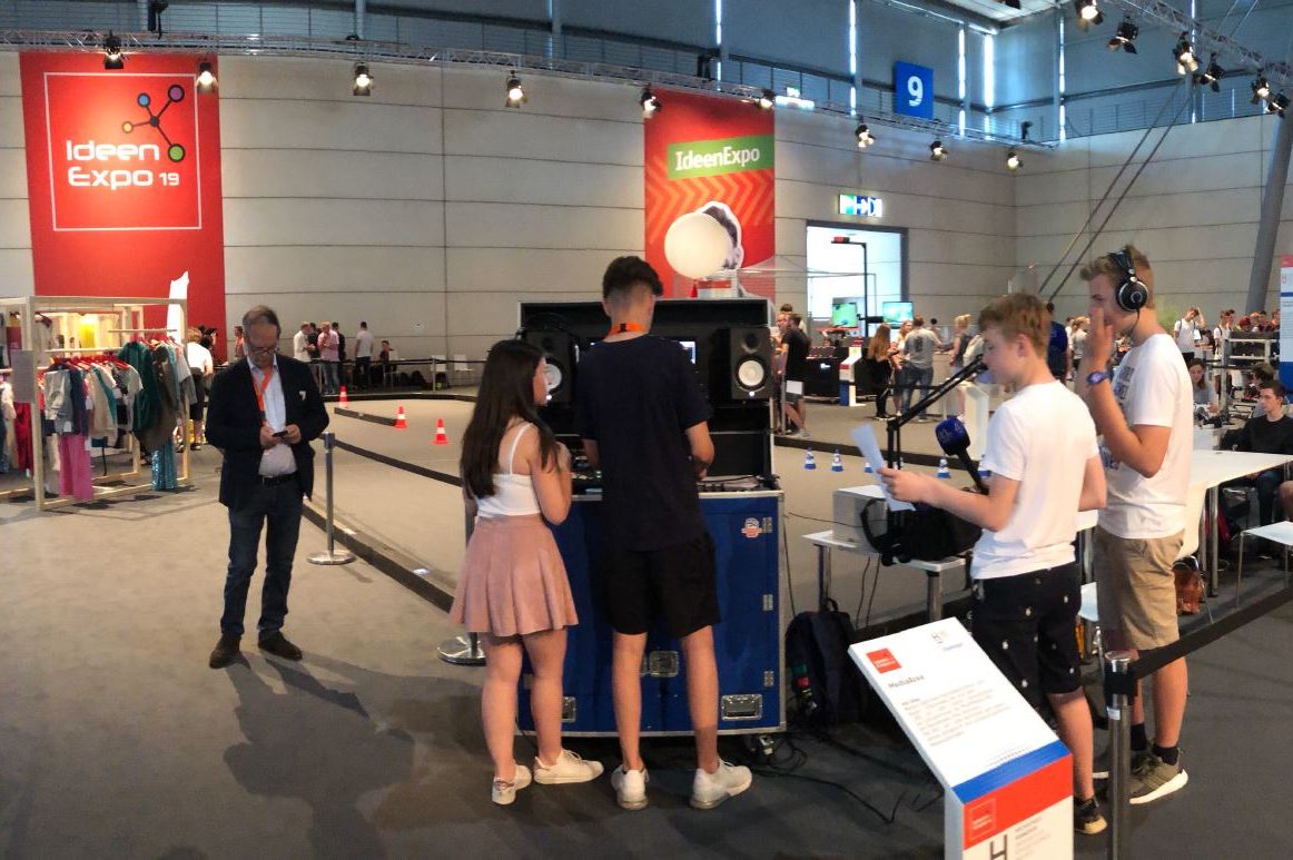 Wir, die Klasse BFB18A von der Multi Media BbS, sind auf der Ideen Expo 2019. An unserem Stand gibt es eine mobile Radiostation mit Mikrofonen, Lautsprechern und einem Mischpult, an dem Besucher der Messe das Wetter, den Verkehr und einen Show-Opener für eine Radiosendung moderieren können.