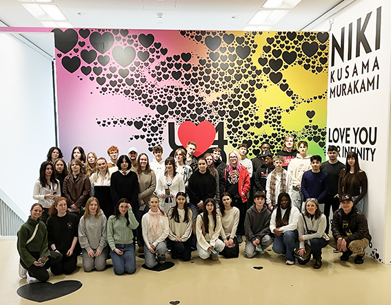 Zeitgenössische Kunst außerhalb des Klassenraums – am 12.02.2026 hatten 2 FOG-Klassen in Begleitung von 2 Lehrkräften kurz vor Ende der Sonderausstellung die Gelegenheit, die Ausstellung „Niki.Kusama.Murakami“ im Sprengel Museum Hannover zu besuchen. Nach intensiver Vorbereitung im Unterricht – mit Recherche und Präsentationen zu Niki de Saint Phalle, Yayoi Kusama und Takashi Murakami – konnten die SchülerInnen die Werke im Original erleben.