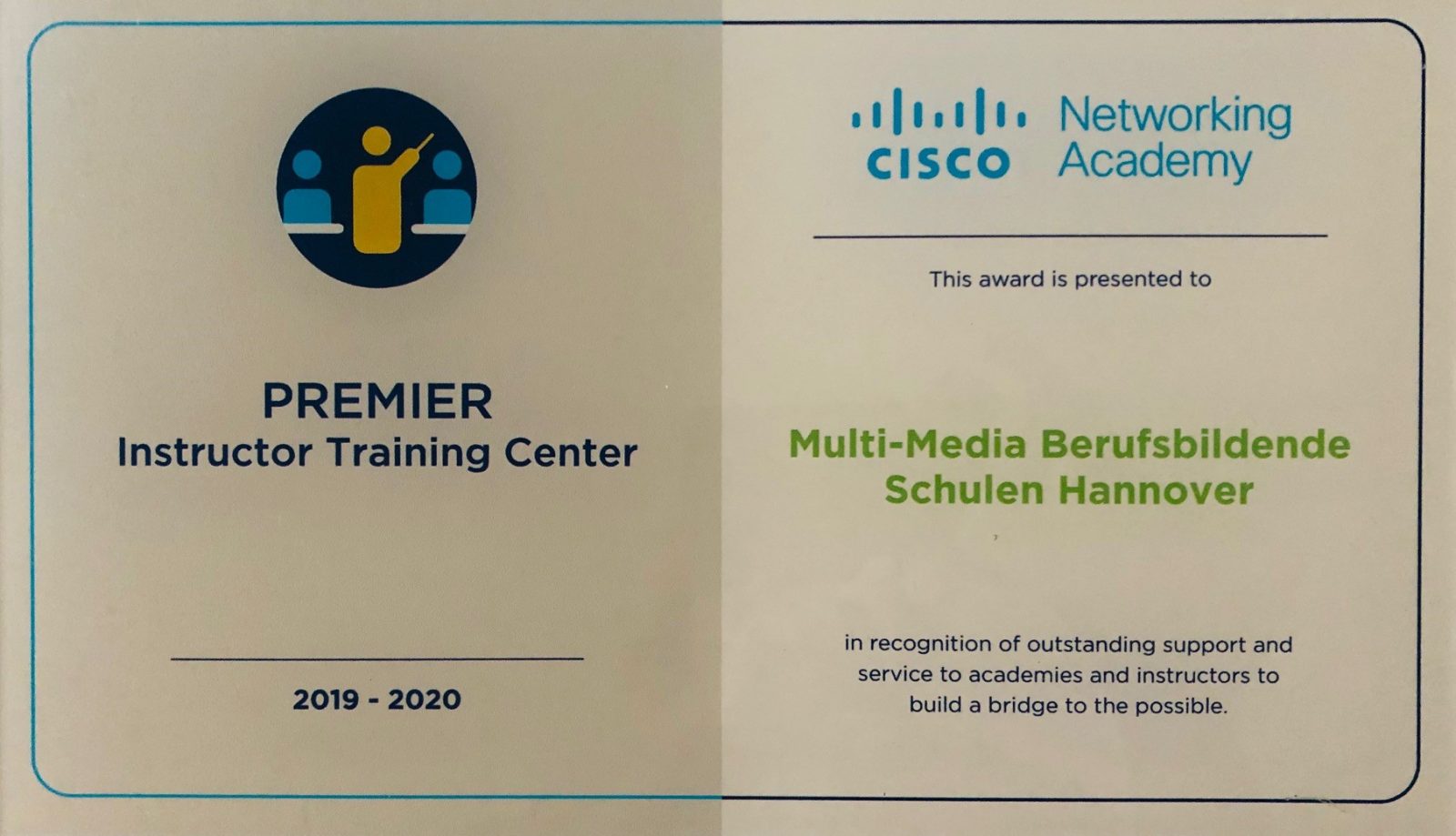 Auf der Partner Conference EMAR 2019 in Lissabon ist die MMBbS mit dem Premier Award für herausragende ITC-Leistungen im Cisco Networking Academy Programm ausgezeichnet worden.